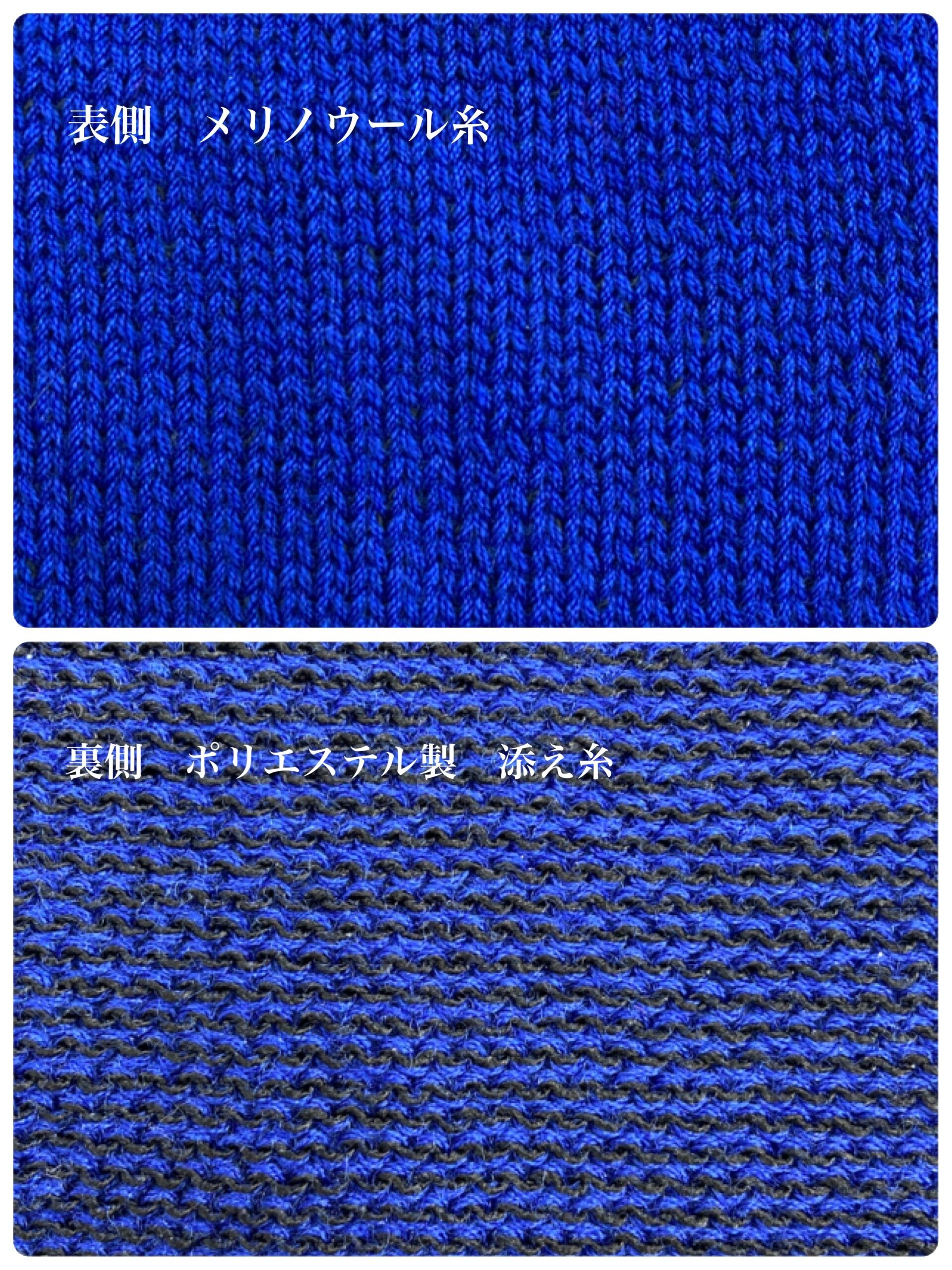 「添え糸編み」という機械編みならではの技法を使い、表側がメリノウール、裏側にポリエステル製の糸を添わせて編み立てています。